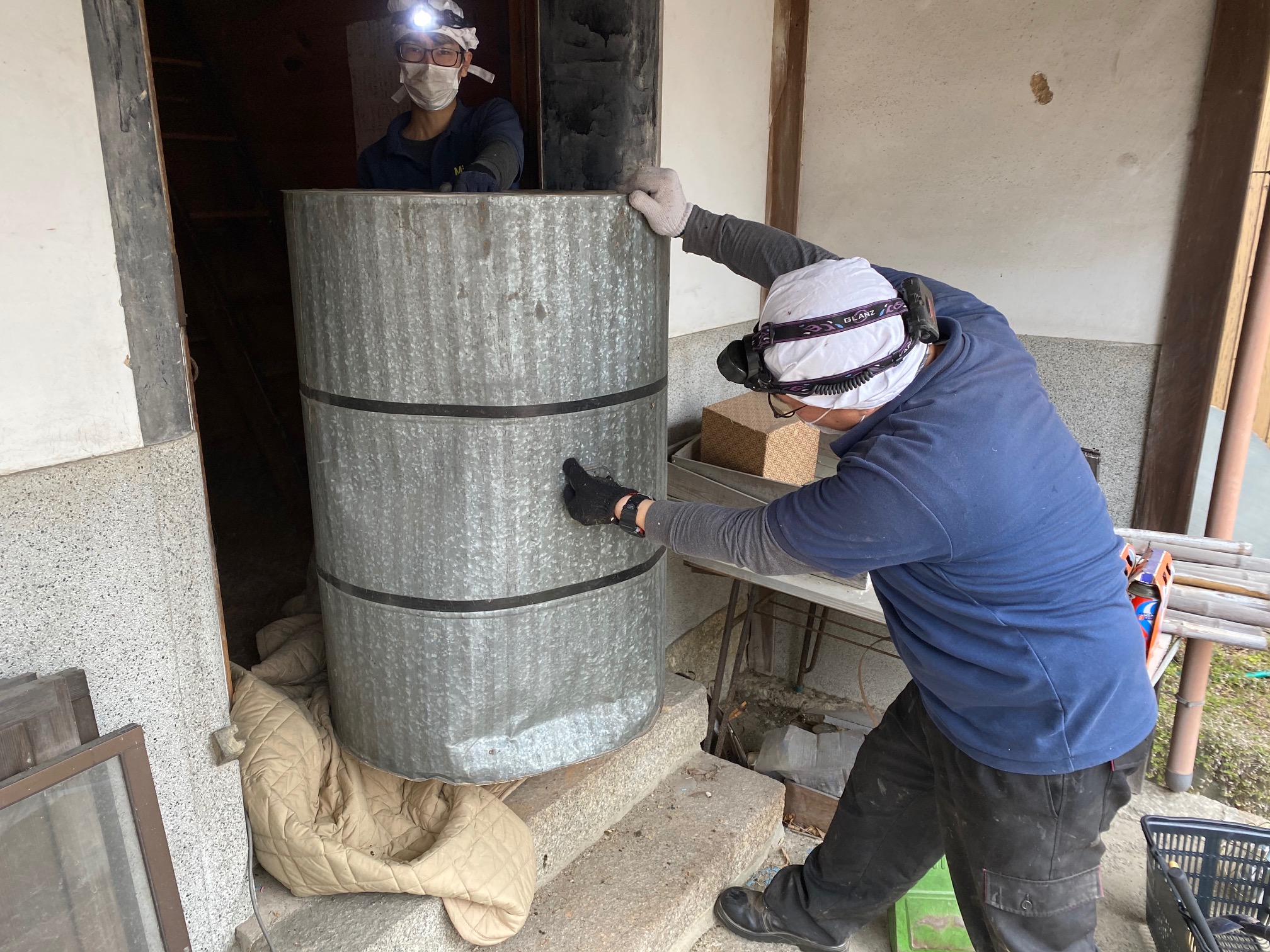 右の写真は、80キロの金庫を階段から降ろす様子です。